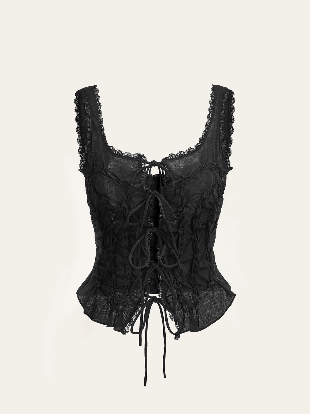 Semi-Sheer Lace-Trimmed Ruched Corset Top