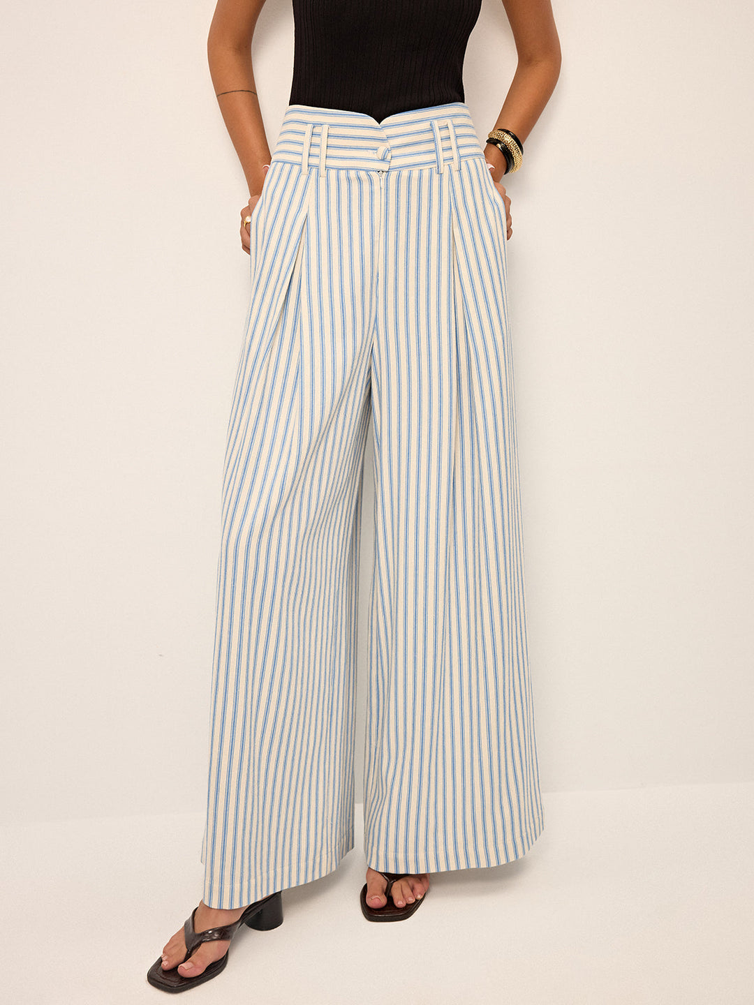 Cotton Striped Pleated Wide-Leg Pants