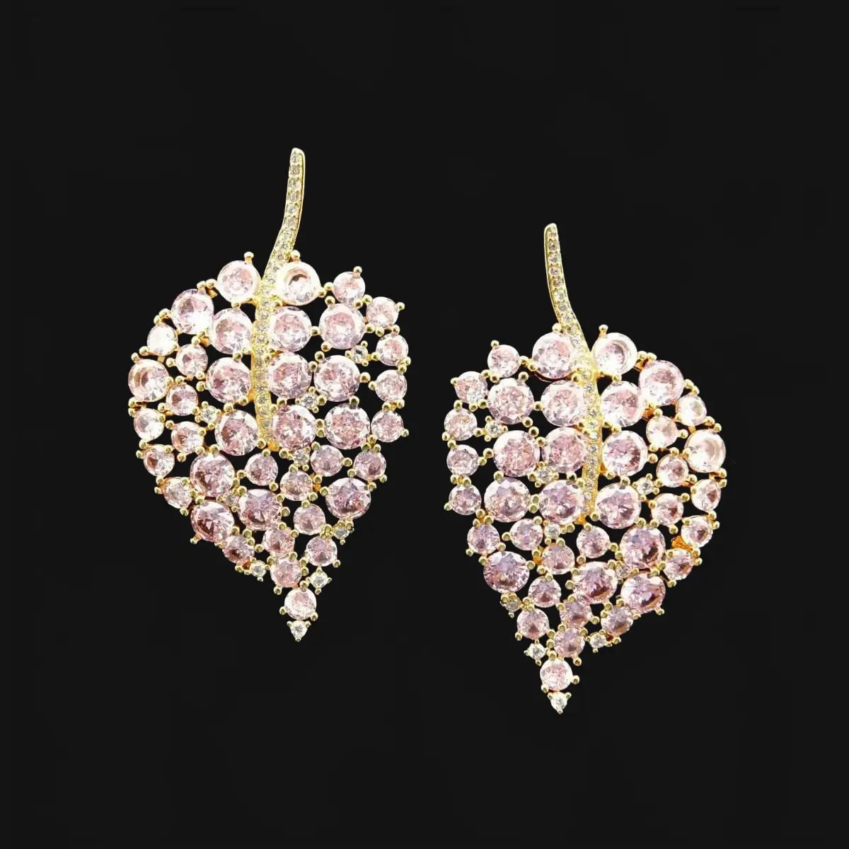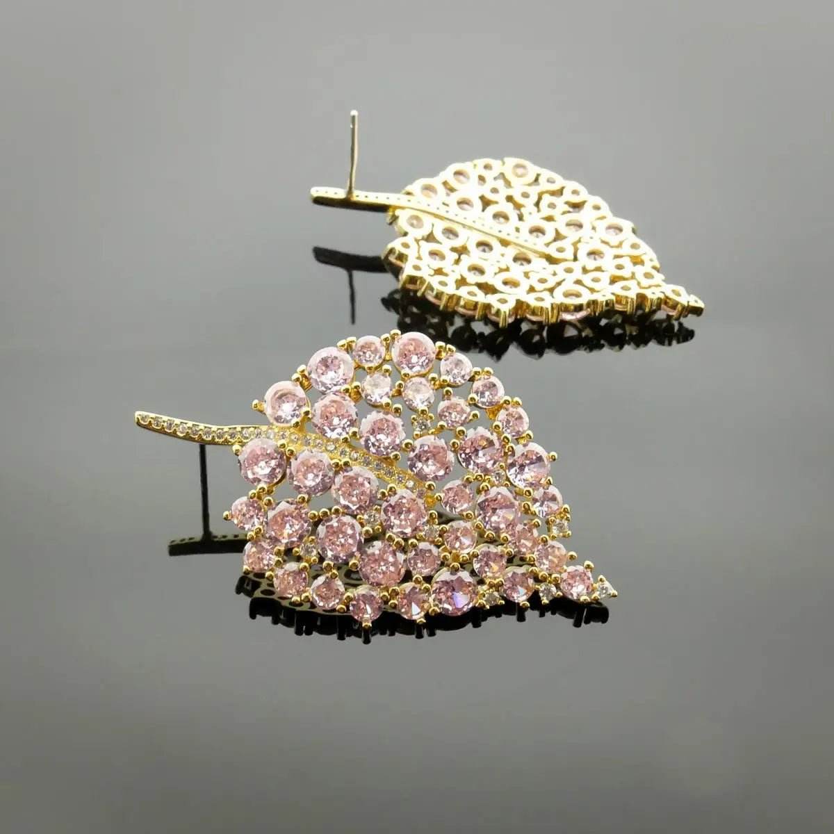 These gold-colored earrings with pink zirconia stones feature leaf-shaped ornaments set with round, faceted zirconia stones, interspersed with small white zirconia stones. The posts are made of 925 silver. Dimensions: 4.6 x 2.7 cm.