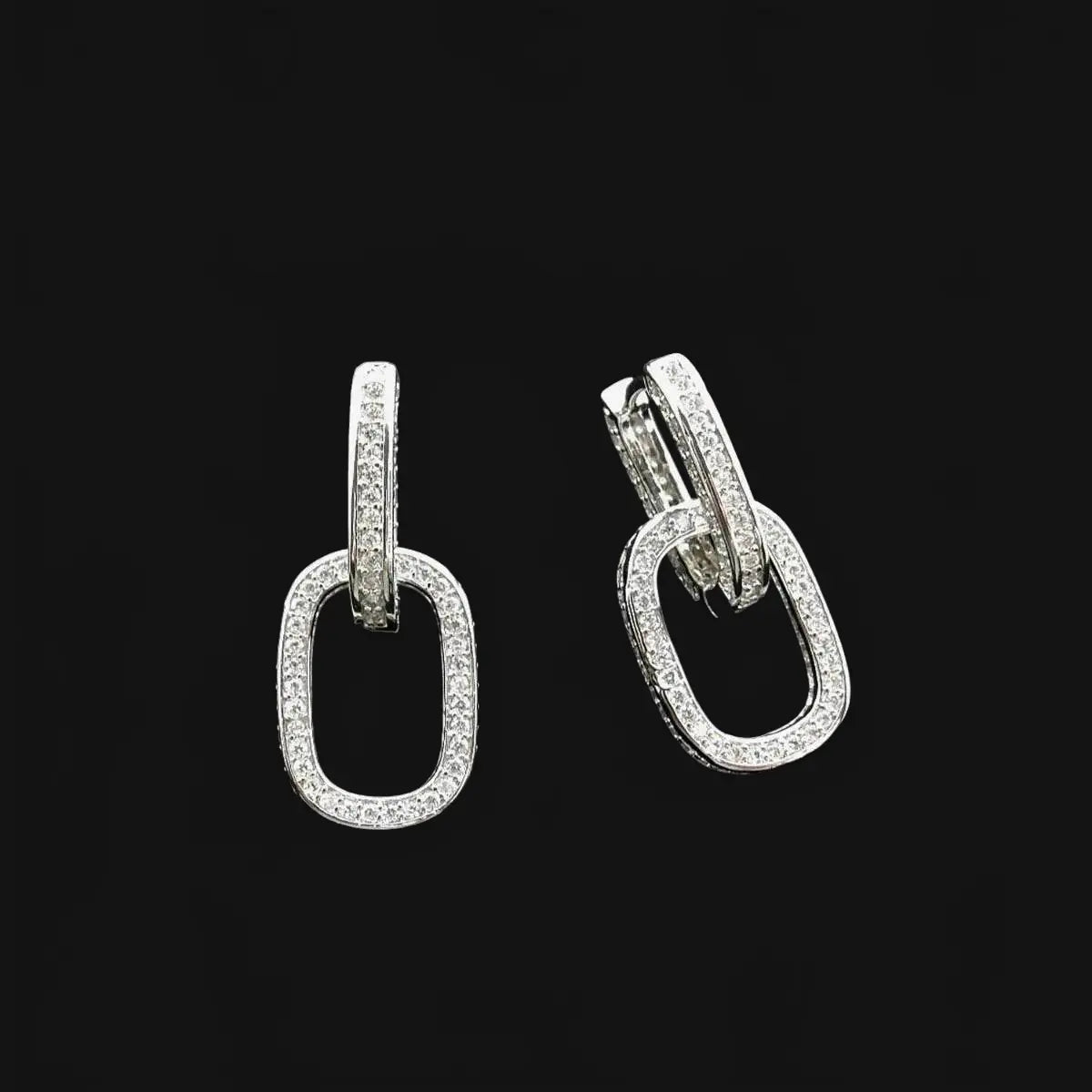 These silver-colored link earrings with zirconia feature oval hoop earrings set all around with zirconia, with a removable oval ornament set all around with zirconia. Dimensions: 2.9 x 1.3 cm.